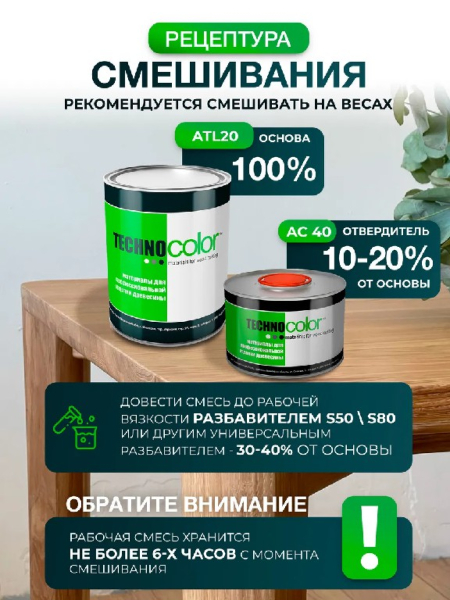 Двухкомпонентный лак рекомендуется смешивать на весах в пропорциях – лак-основа – 100%, отвердитель 10-20%. Довести смесь до рабочей вязкости разбавителем S50 \ S80 или другим универсальным разбавителем – 30-40 % от основы.