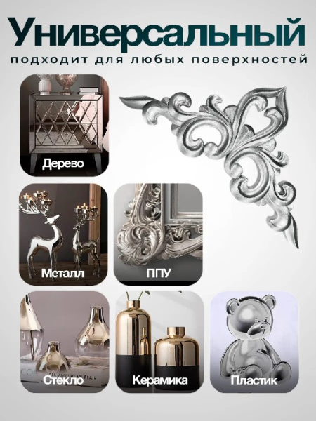 Декоративная краска – спецэффект ХРОМ . – это профессиональная высоко пигментированная металлизированная эмаль для мебели, декора и творчества с роскошным зеркальным эффектом. Имеет яркий и насыщенный металлический блеск. Погрузитесь в мир безграничных возможностей с нашей уникальной жидкой поталью с хромирующим эффектом!Эта акриловая краска с металлическими пигментами — ваш идеальный помощник для создания выразительных декоративных эффектов металлик в различных техниках декора, творчества и художественного оформления, которые преобразят любой интерьер. Эмаль образует яркое покрытие с высокой степенью блеска и отражающей способностью, сравнимое с зеркальной поверхностью. Этот продукт открывает широкие возможности для отделки мебели, предметов интерьера, аксессуаров и художественных работ. Образует гладкое, устойчивое к выцветанию покрытие. Предназначен для внутренних работ. Не рекомендуется наносить эмаль на поверхности, подвергающиеся регулярному механическому воздействию. Для наибольшей долговечности и влагостойкости, изделия, подверженные эксплуатационной нагрузке, можно покрыть лаком, используя аэрозольный реставрационный лак TECHNOCOLOR серии ATL70. Нанесение лака поверх эмали снижает декоративный эффект покрытия.