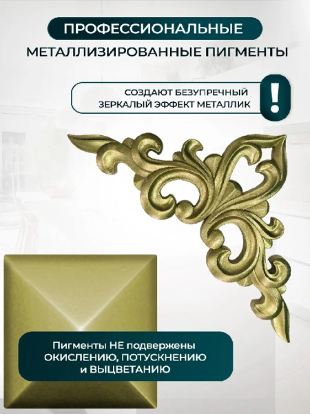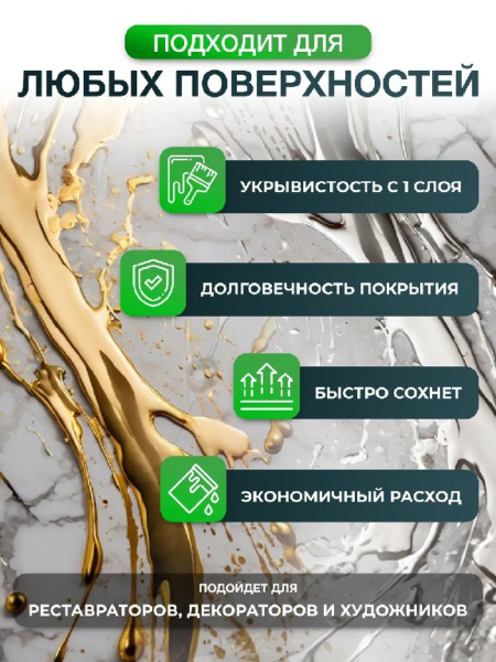 Металлизированная краска на основе растворителя, которая с большим успехом заменяет золочение, имитирует сусальное покрытие и при этом существенно уменьшает стоимость декоративных работ. Декоративный эффект хром помогает создать имитацию золота и серебра различных оттенков. Используется для декорирования различных изделий из дерева, металла, ППУ, стекла и других материалов.Способ применения и расход: