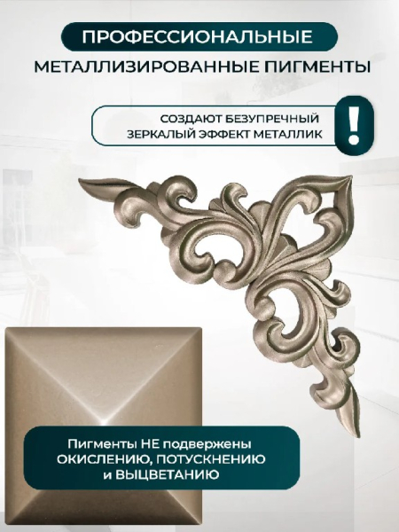 Металлизированная краска на основе растворителя, которая с большим успехом заменяет золочение, имитирует сусальное покрытие и при этом существенно уменьшает стоимость декоративных работ. Декоративный эффект хром помогает создать имитацию золота и серебра различных оттенков. Используется для декорирования различных изделий из дерева, металла, ППУ, стекла и других материалов.Способ применения и расход: