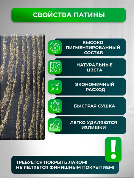 Патина используется для окраски мебели и других изделий из дерева внутри помещений с целью придания этим изделиям эффекта "старения".Способ применения и расход: