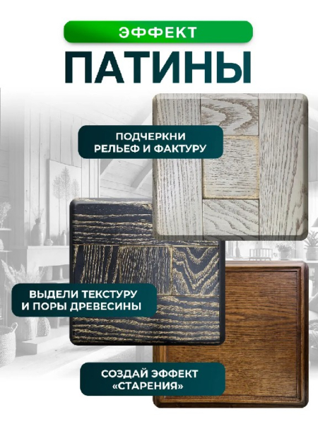 Патина используется для отделки мебели и других изделий из дерева внутри помещений с целью придания этим изделиям эффекта "старения", выделения декоративных элементов.Способ применения и расход: