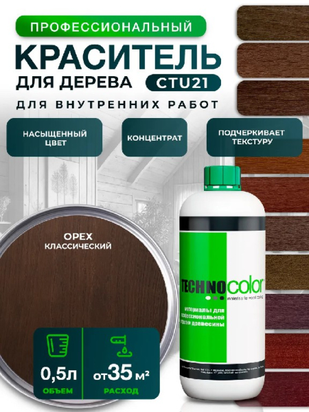 Профессиональный концентрированный краситель для дерева универсальный CTU21, цвет орех классический - это идеальное средство для тонирования и декоративной отделки древесины, которое способно добавить вашему интерьеру тепла и уюта, подчеркивая натуральную красоту дерева.Высококачественные пигменты обеспечивают равномерное и глубокое проникновение в структуру дерева, создавая насыщенный и долговечный оттенок.