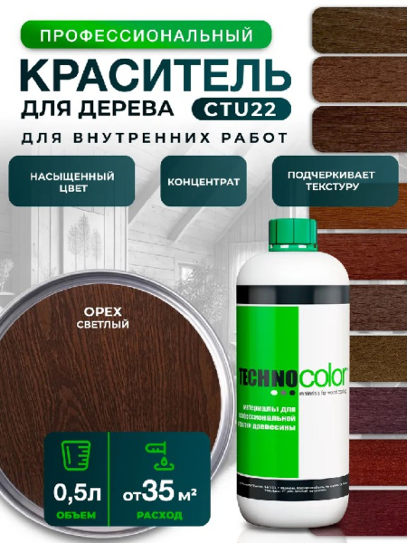 Профессиональный концентрированный краситель для дерева универсальный CTU22, цвет орех светлый - это идеальное средство для тонирования и декоративной отделки древесины, которое способно добавить вашему интерьеру тепла и уюта, подчеркивая натуральную красоту дерева.Высококачественные пигменты обеспечивают равномерное и глубокое проникновение в структуру дерева, создавая насыщенный и долговечный оттенок.