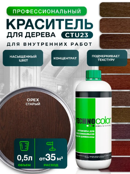 Профессиональный концентрированный краситель для дерева универсальный CTU23, цвет орех старый - это идеальное средство для тонирования и декоративной отделки древесины, которое способно добавить вашему интерьеру тепла и уюта, подчеркивая натуральную красоту дерева.Высококачественные пигменты обеспечивают равномерное и глубокое проникновение в структуру дерева, создавая насыщенный и долговечный оттенок.